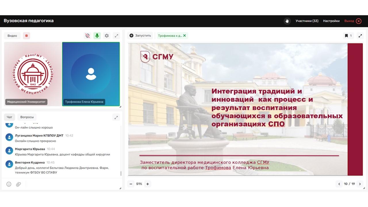 Заместитель директора по воспитательной работе Медицинского колледжа СГМК Трофимова Елена Юрьевна приняла участие в III Международном научно-педагогическом форуме «Интеграция медицинского и фармацевтического образования, науки и практики» (из серии «Вузовская педагогика»), организованном ФГБОУ ВО «Красноярский государственный медицинский университет имени профессора В.Ф. Войно-Ясенецкого» Минздрава России, выступив с докладом «Интеграция традиций и инноваций как процесс и результат воспитания в образовательных организациях среднего профессионального образования» на заседании секции «Среднее медицинское и фармацевтическое образование - модернизация в условиях современных вызовов».