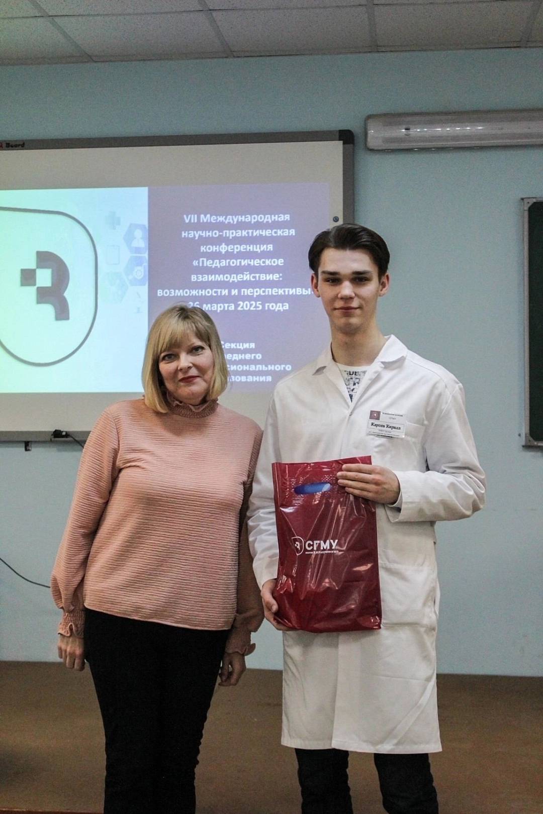 26 марта 2025 года в рамках VII Международной научно-практической конференции «Педагогическое взаимодействие: возможности и перспективы» в Медицинском колледже СГМУ прошла конференция – конкурс студенческих работ секции среднего профессионального образования. Открыла конференцию директор колледжа Лариса Михайловна Федорова, отметив важность данного мероприятия для подготовки квалифицированных медицинских специалистов, готовых к решению задач современного здравоохранения. Конференция-конкурс стала площадкой для обмена опытом и знаниями между будущими медицинскими работниками. Вниманию слушателей были представлены шестнадцать докладов студентов нашего колледжа и Саратовского областного базового медицинского колледжа, посвященные наиболее актуальным вопросам современного медицинского и фармацевтического образования и развития здравоохранения. Студенты продемонстрировали глубокое понимание выбранных тем, умение проводить исследования и представлять результаты. Большой интерес вызвали работы, посвященные людям, чей вклад в развитие медицины вызывает чувство гордости за выбранную профессию и желание равняться на их пример служения науке и Родине. Их имена должен знать каждый человек, связавший свою жизнь с медициной. Дарья Севастопольская, Екатерина Бакунина, Елизавета Хитрово, Александра Травина, великие ученые, врачи, педагог – Василий Иванович Разумовский, Сергей Романович Миротворцев, Михаил Федорович Волков, Сергей Иванович Спасокукоцкий, Николай Романович Иванов, Федор Григорьевич Углов, Анатолий Иванович Китов. Мы помним эти имена и продолжаем их дело. Целый блок докладов был посвящен развитию цифровых технологий в различных сферах здравоохранения. Студенты рассказали об использовании медицинских информационных систем, работе цифровых аптечных программ, о цифровизации и внедрении искусственного интеллекта в стоматологию ортопедическую, а также об использовании виртуальной и дополненной реальности в медицинском образовании. И конечно большое внимание в студенческих работах было уделено