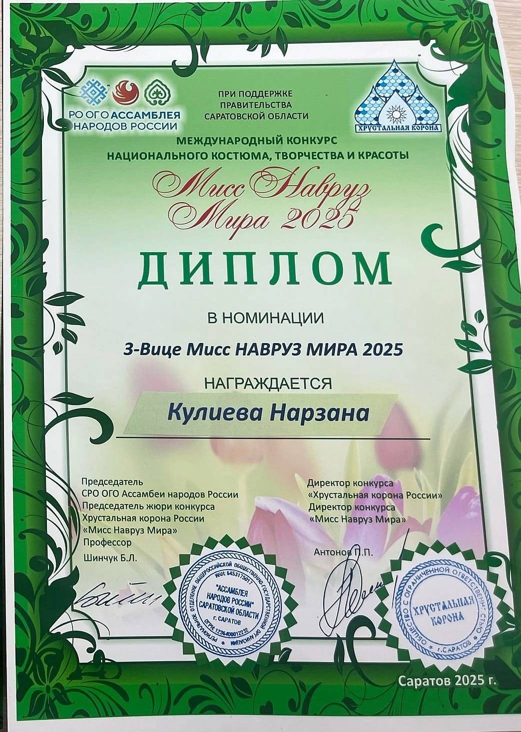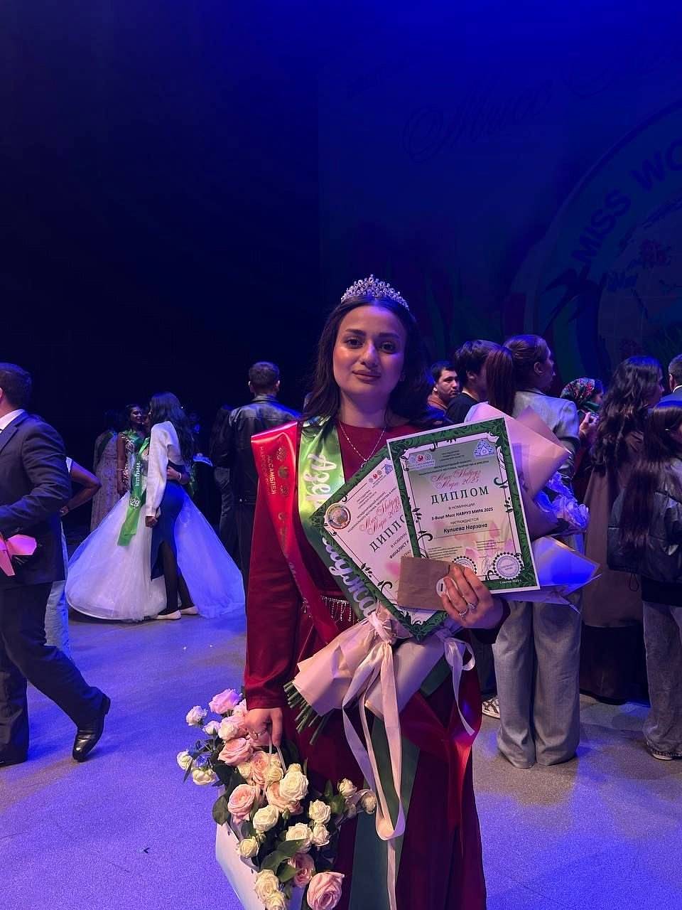 Студентка Медицинского колледжа СГМУ 2 курса 204 группы специальности «Сестринское дело» Нарзана Кулиева удостоена титула «3 Вице Мисс Навруз мира 2025», представив традиции и культуру