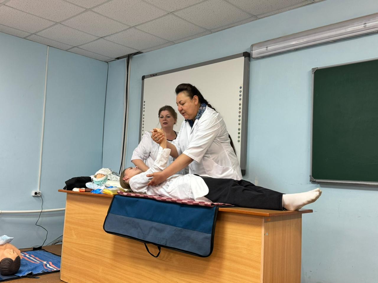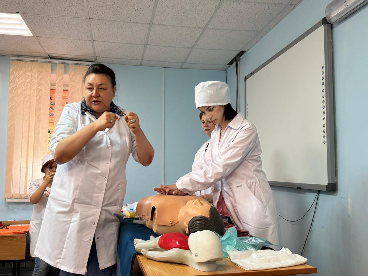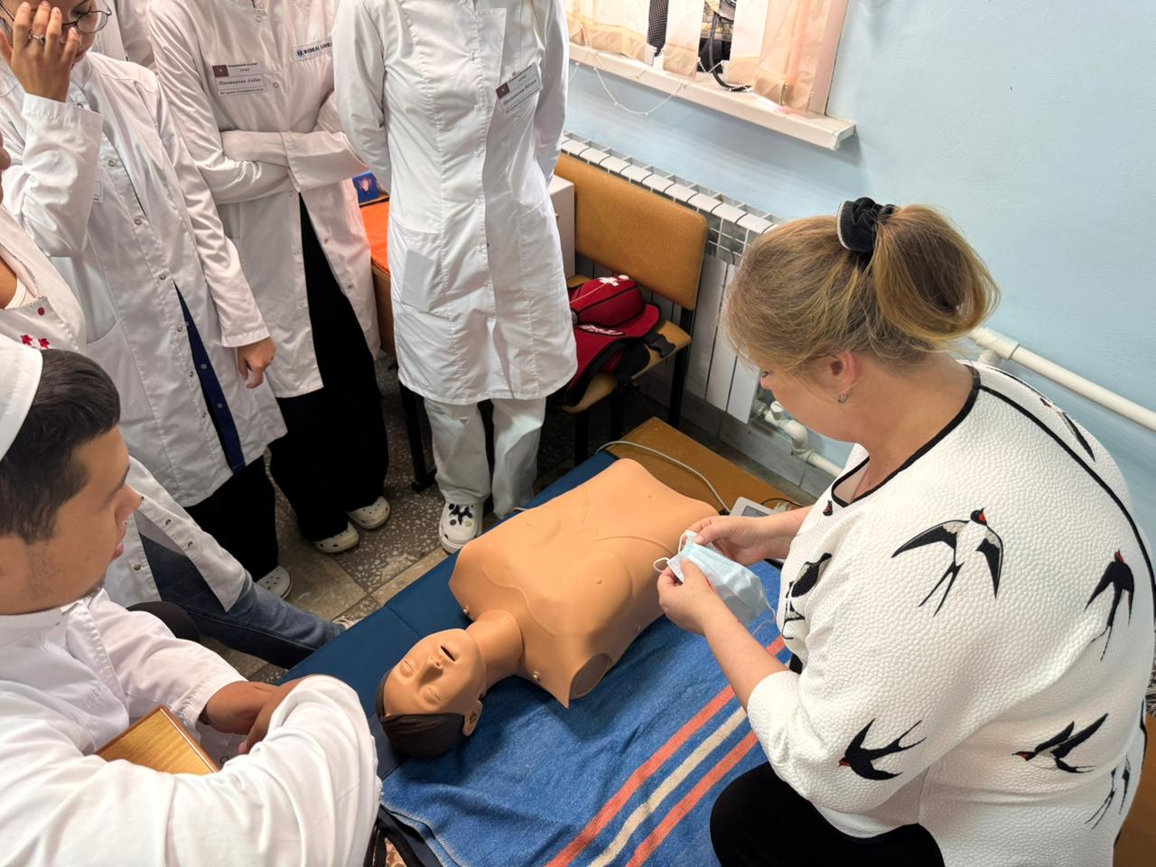 Студенты на фантомах показывали приёмы первой помощи. Отработка указанных приёмов на тренажёрах с использованием подручных средств помогает формировать полезные навыки, чтобы не растеряться в экстренной ситуации и действовать чётко и быстро.