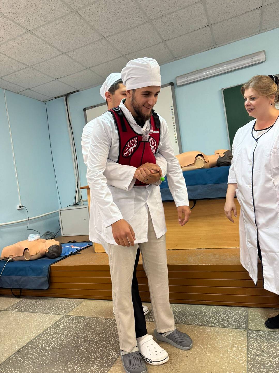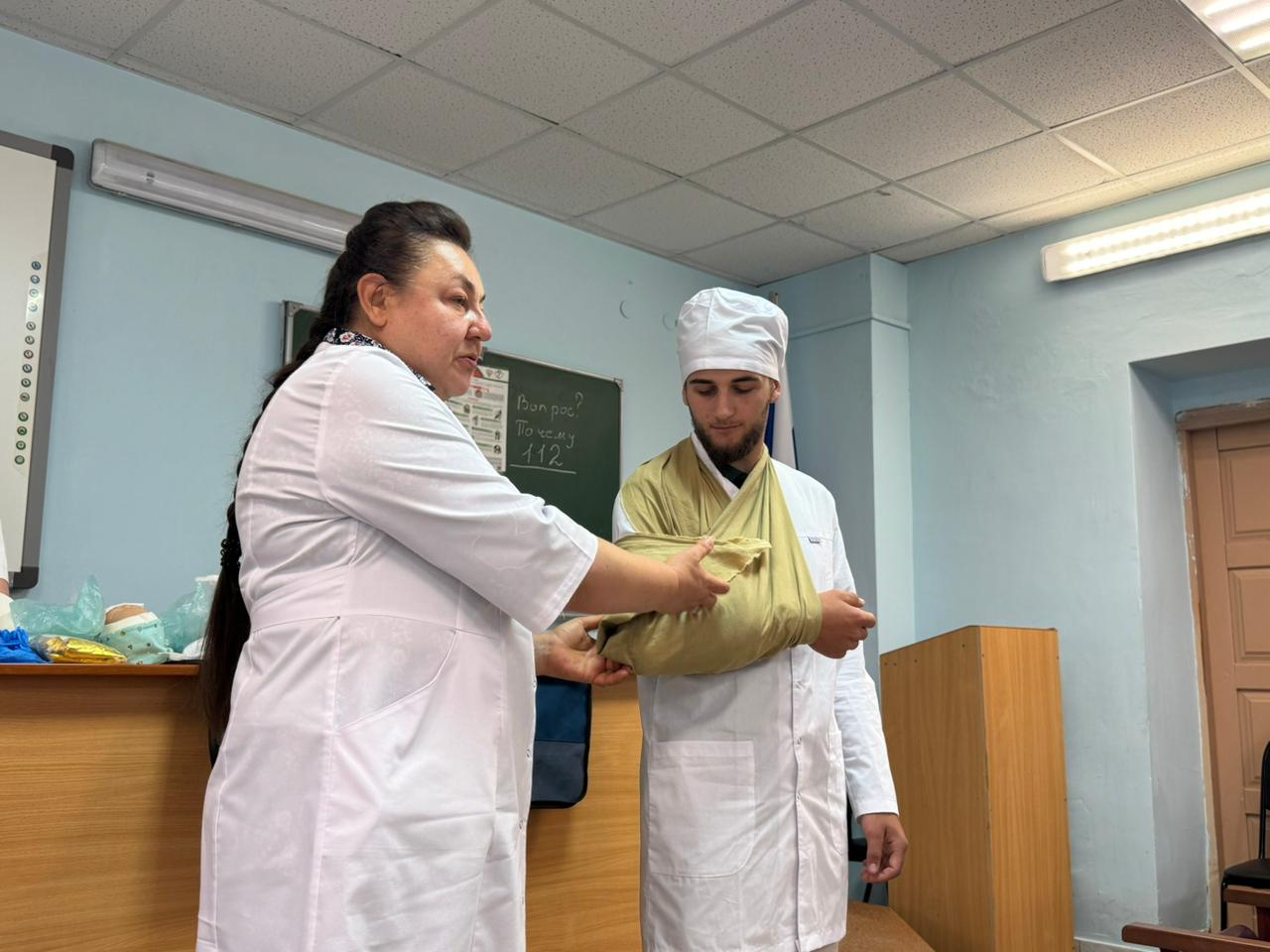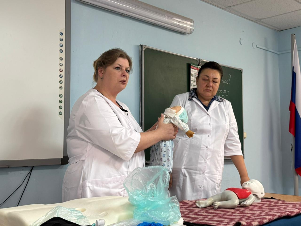 Студенты на фантомах показывали приёмы первой помощи. Отработка указанных приёмов на тренажёрах с использованием подручных средств помогает формировать полезные навыки, чтобы не растеряться в экстренной ситуации и действовать чётко и быстро.