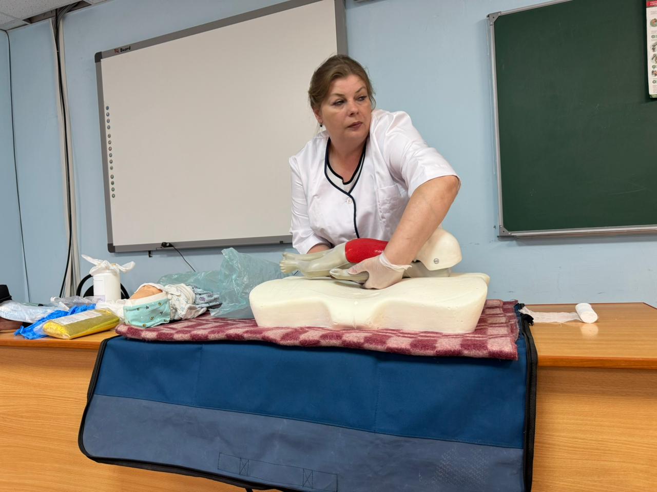 Преподаватели продемонстрировали алгоритм действий при проведении осмотра пострадавшего, выполнение сердечно лёгочной реанимации у детей и взрослых, применение приёма Геймлеха для устранения инородного тела из дыхательных путей, а также различные способы временной остановки травматического кровотечения – наложение давящей повязки, турникета, тампонада раны.