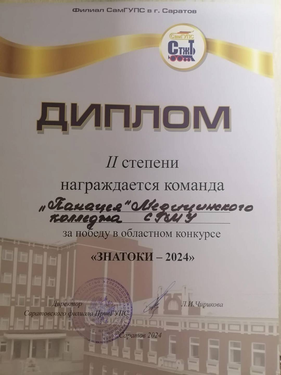 Команда «Панацея» Медицинского колледжа СГМУ заняла II место в областном конкурсе «Знатоки-2024». Вот имена призеров – Щегравина Яна (203 группа), Горбачев Василий (311 группа), Никульшин Тимур (303 группа), Русяйкин Тимофей (101 группа), Селимов Магамед (104 группа).