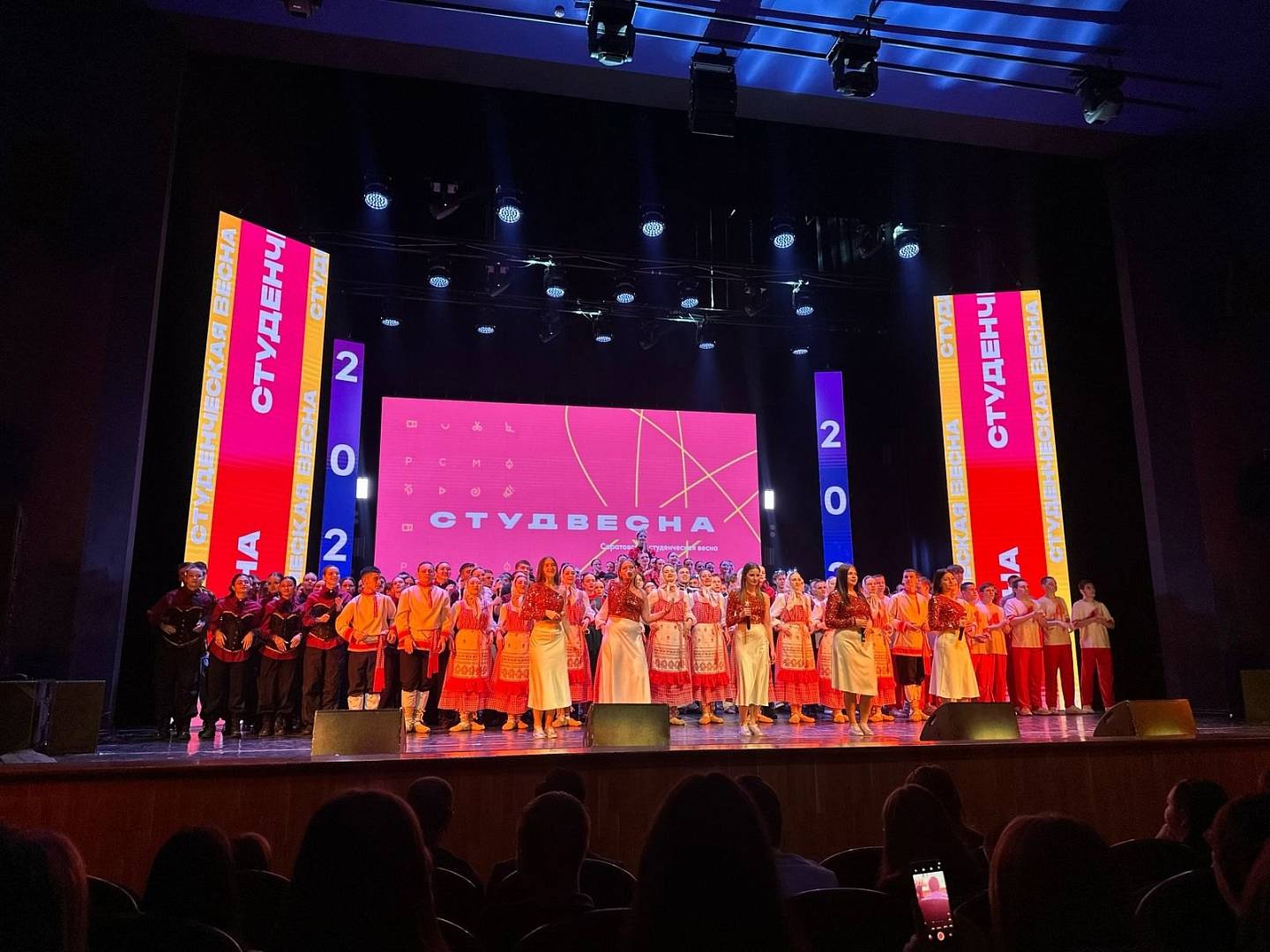 На сцене Саратовского ТЮЗа состоялся Гала-концерт ежегодного областного фестиваля «Саратовская студенческая весна». Программу концерта открыл тематический блок, посвященный 80-летию Победы в Великой Отечественной войне, в котором приняли участие вокальный ансамбль «Новая версия» и ансамбль танца «Триони» Медицинского колледжа СГМУ.