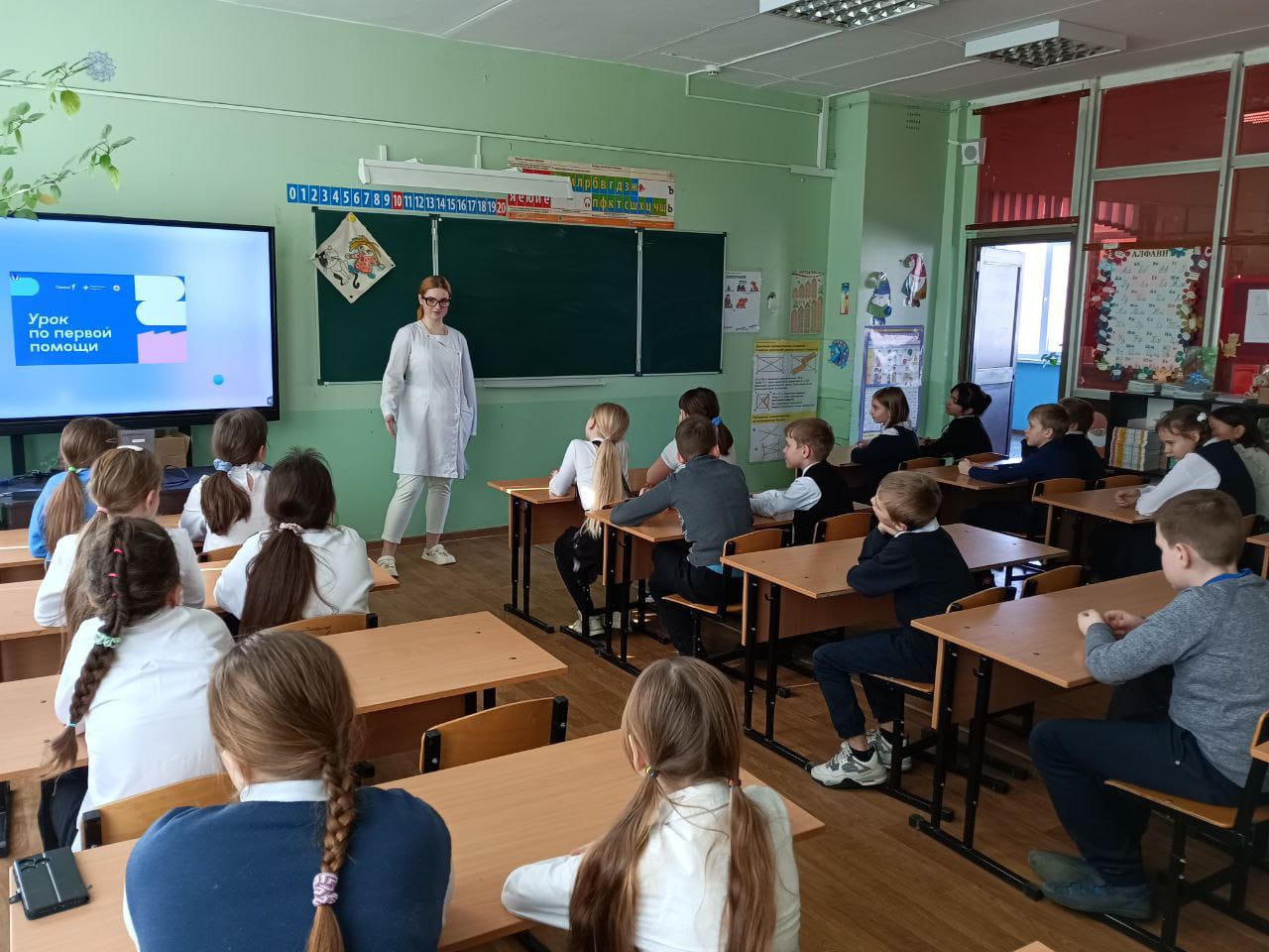 По приглашению администрации МОУ «СОШ №105» г. Саратова пос. Жасминный в рамках реализации Всероссийского проекта «Первая помощь» студентка 3 курса 303 группы специальности «Сестринское дело» Соболева Елизавета провела интерактивные уроки по оказанию первой помощи пострадавшим для учащихся 4-го и 7-го классов. В начале урока Елизавета провела блиц-опрос по выявлению у школьников знаний по вопросам бытовых и чрезвычайных ситуаций, требующих оказание первой помощи пострадавшим.